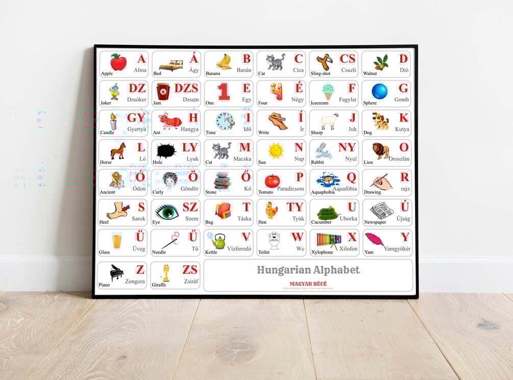 HUNGARIAN Alphabet Chart with Color Pictures, HUNGARIAN Words, their English Translations and Pronunciation as a Printable Art